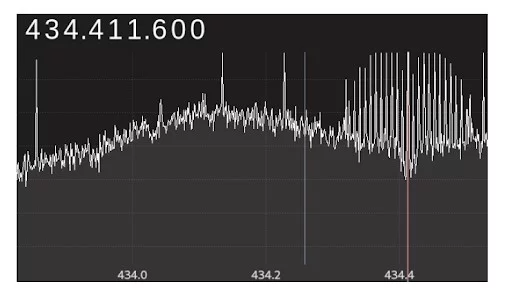 Per prima cosa bisogna capire in quale banda il segnale dell’auto opera, basta aprire gqrx e settare il device rtl come input per iniziare a visionare lo spettro nella frequenza decisa. All’interno dell’Unione Europea le chiavi per autovetture utilizzano una banda intorno ai 433 MHz, si sceglie di visionare i segnali attorno a quella frequenza e si attiva il segnale dalle chiavi dell’auto per poi successivamente visionare il comportamento dello spettro.
