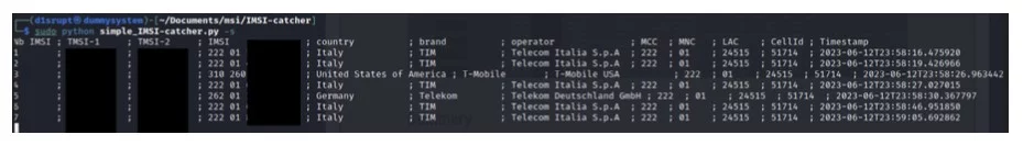 Per poter però eseguire lo “sniffing” si può utilizzare simple_IMSI-catcher.py con il flag “- s”, tale programma farà sì che venga impersonificata la BTS precedentemente scelta (tramite la scelta della frequenza) e forzerà i subscriber in range accedendo alla falsa BTS ottenendo cosi le informazioni ad essa inviate. Quando un device sta cercando una BTS invia dei segnali in broadcast (contenenti l’MCC e MNC) infine IMSI-catcher risponde a tale segnali con un segnale radio più potente della BTS originale (i device sono programmati in modo che si connettino alla stazione con potenza maggiore).