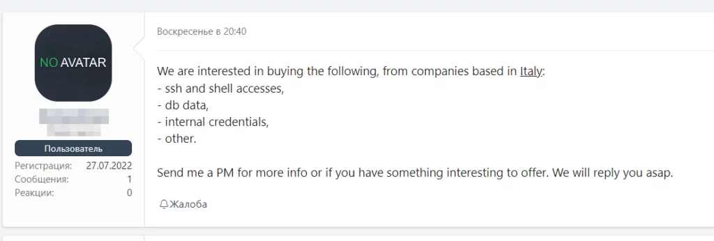 Richiesta di acquisto su un noto forum underground russo