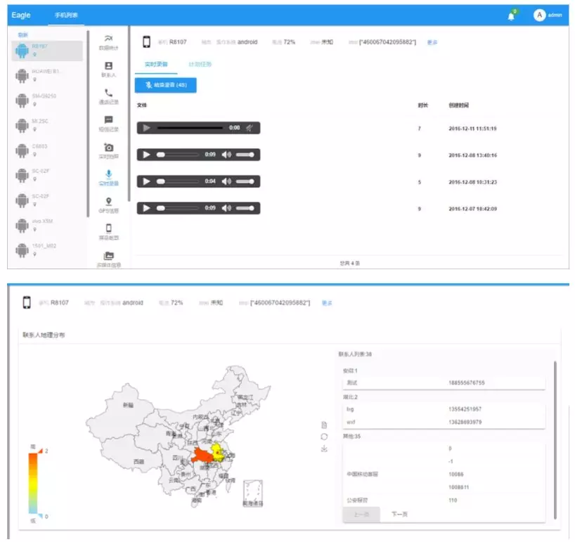 Il pannello di amministrazione del malware si chiama “Stability Maintenance Judgment System”. Consente agli operatori remoti di avviare azioni in tempo reale come la registrazione dell’audio, la visualizzazione della distribuzione geografica dei contatti di una vittima e il monitoraggio dei messaggi.