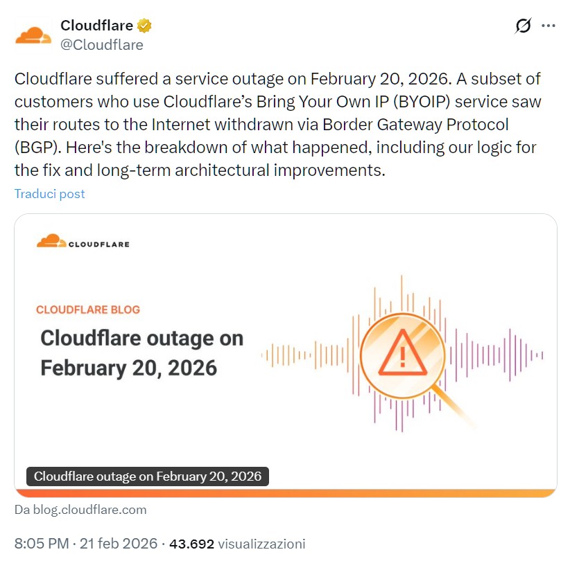 È esattamente quello che è successo il 20 febbraio 2026, quando una grossa fetta di utenti si è ritrovata isolata dal resto del mondo digitale. Insomma, una di quelle giornate che un sistemista non vorrebbe mai vivere, dove i prefissi BGP spariscono e i servizi diventano fantasmi.