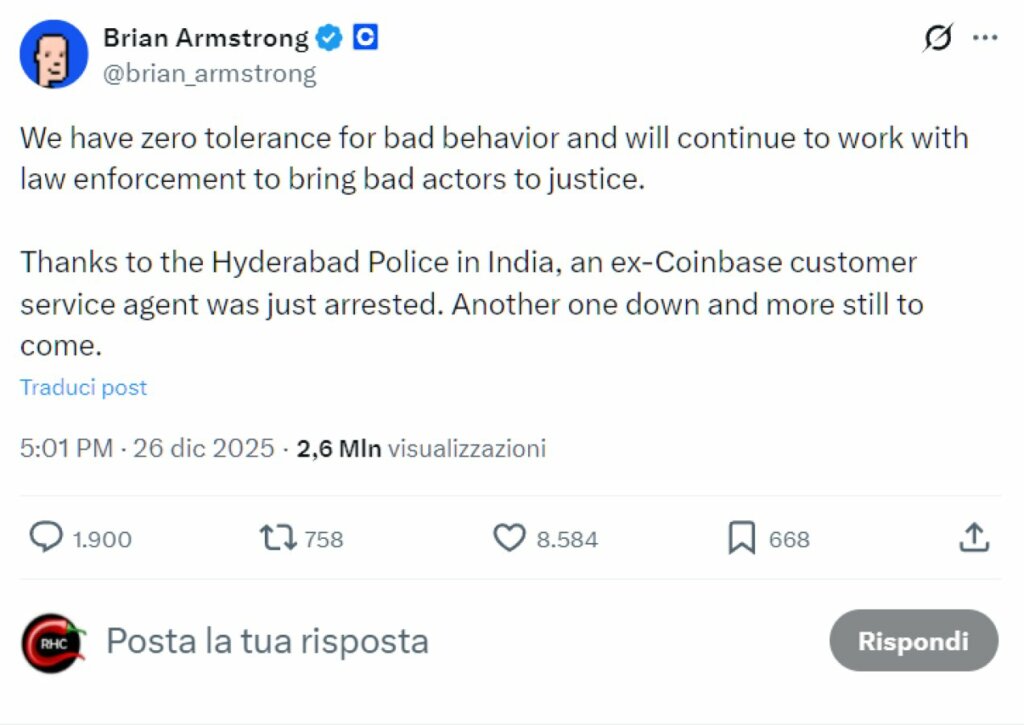 Coinbase ha annunciato i primi arresti nel caso di vendita di dati dei clienti: a Hyderabad, in India, la polizia ha arrestato un ex dipendente dell’assistenza clienti sospettato di corruzione e condivisione di dati dei clienti con criminali. Il CEO di Coinbase, Brian Armstrong, ha scritto questo il 26 dicembre , aggiungendo che seguiranno altri arresti.