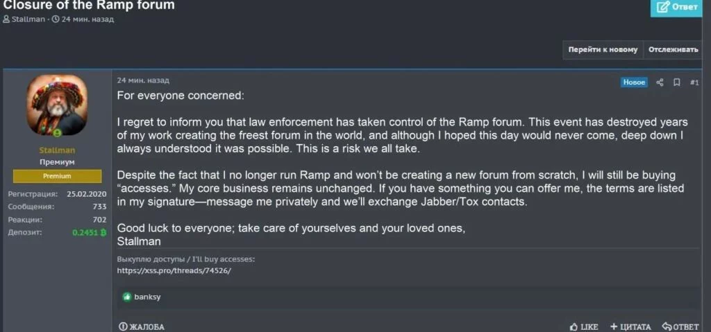 La conferma definitiva della chiusura è arrivata anche da un post pubblicato direttamente sul forum, firmato dall’utente “Stallman”, figura storicamente associata alla gestione di RAMP. Nel messaggio, l’autore scrive: “I regret to inform you that law enforcement has taken control of the Ramp forum. This event has destroyed years of my work creating the freest forum in the world”.