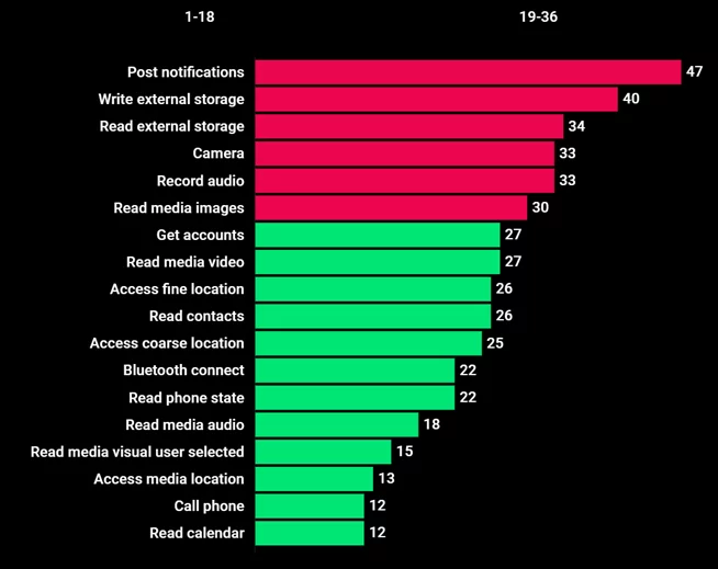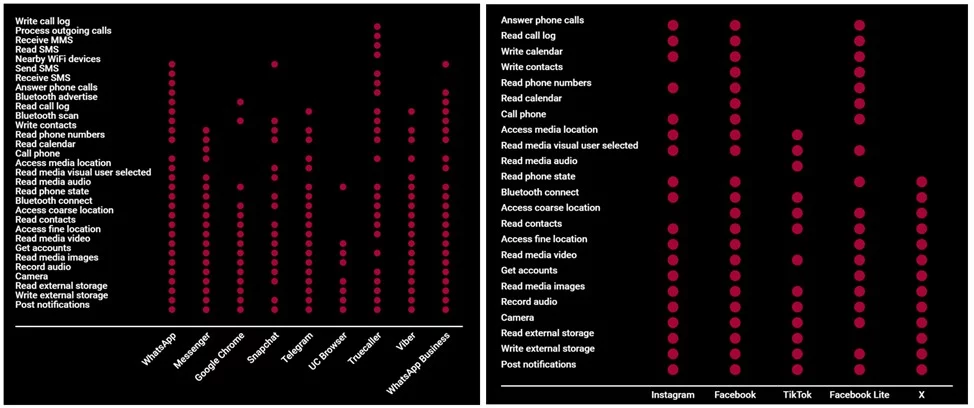 Da uno studio sui permessi è emerso che la maggior parte delle applicazioni appartenenti alla categoria comunicazione e social networking richiedono il maggior numero di accessi. Il numero medio di permessi per le app di comunicazione è stato di 19, e per i social network – 17. Tuttavia, alcune app, come WhatsApp e Messenger, richiedono l’accesso al controllo delle chiamate, allo stato del telefono e alla posizione precisa, sebbene queste funzioni non siano sempre ovvie per gli utenti e non sono sempre direttamente correlate alle funzionalità di base dell’applicazione.