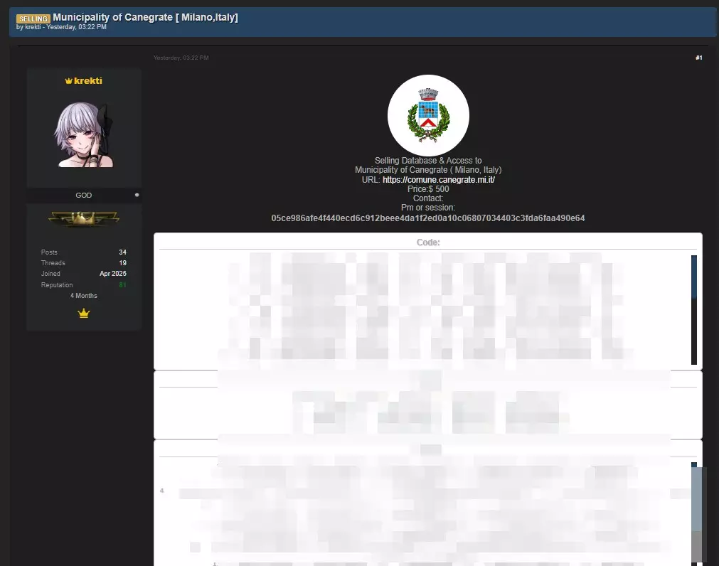 Nella giornata di ieri, su un noto forum underground frequentato da cyber criminali, è apparso un post che riguarda direttamente il Comune di Canegrate (Milano, Italia).