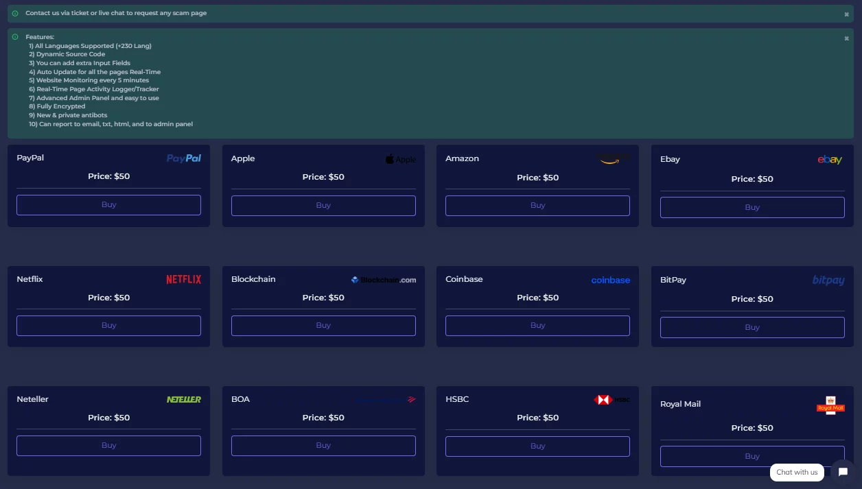 Soluzione di Phishing as a Service con pagine già pronte all’utilizzo che possono essere acquistate a partire di 50 euro