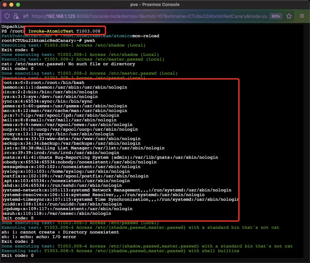 Invochiamo un test che corrisponde alla tecnica del MITRE T1003.008 : Credential Dumping . Proveremo quindi a dumpare /etc/shadow che contiene informazioni sulle password degli utenti del sistema. Ogni riga nel file rappresenta un account utente e ogni riga contiene nove campi separati da virgole.