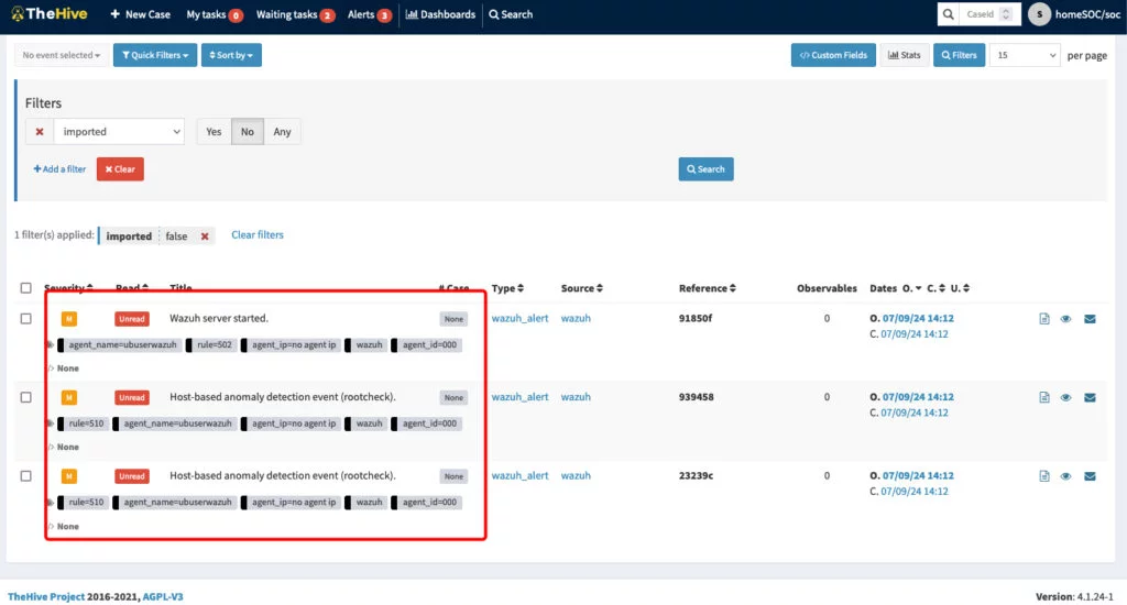 Come si puó notare, sull interfaccia di Wazuh si sono manifestati gli eventi appena invocati cosi come su TheHive: