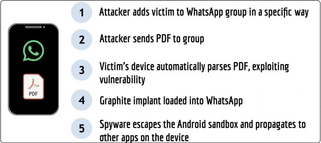 Come hanno ora rivelato gli esperti di Citizen Lab , gli aggressori hanno aggiunto le future vittime ai gruppi WhatsApp e poi hanno inviato loro un file PDF. Il dispositivo della vittima ha elaborato il file dando accesso all’exploit 0-day che ha consentito l’installazione dello spyware Graphite.