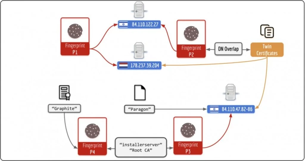 “L’infrastruttura includeva server cloud che erano probabilmente stati affittati da Paragon o dai suoi clienti, così come server che potrebbero essere stati ubicati nei locali di Paragon e dei suoi clienti governativi. L’infrastruttura scoperta era collegata a pagine web chiamate “Paragon” che venivano restituite da indirizzi IP in Israele (dove ha sede Paragon), nonché a un certificato TLS contenente il nome dell’organizzazione Graphite. Lo stesso nome è dato allo spyware Paragon. È stato trovato anche un nome comune “installerserver”. Il prodotto spyware concorrente Pegasus usa il termine “Installation Server” per riferirsi ai server progettati per infettare i dispositivi con spyware”, scrivono gli esperti.