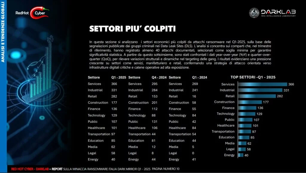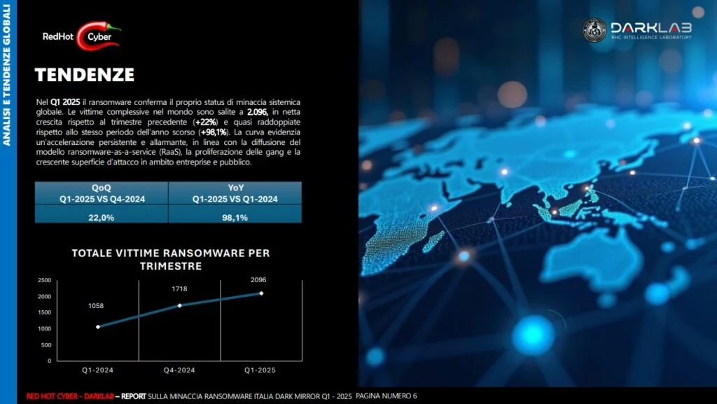 DarkMirror Report Q1 2025 di DarkLab (Red Hot Cyber) è una delle analisi più approfondite sul fenomeno ransomware in Italia e a livello globale. Il documento si apre sottolineando l’aumento record di attacchi nel nostro Paese: 45 casi confermati solo nel primo trimestre, il numero più alto mai registrato, a conferma di una crescita costante della pressione cyber su settori pubblici e privati italiani.
