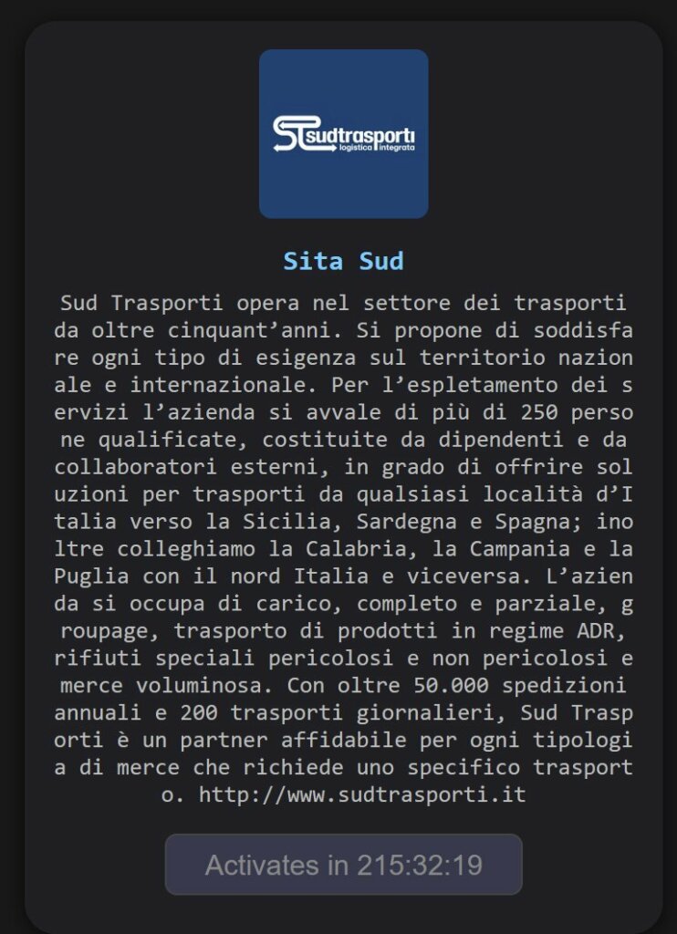 Come visibile dagli screenshot acquisiti, il logo utilizzato e la descrizione aziendale (“Sud Trasporti opera nel settore dei trasporti da oltre cinquant’anni… carichi completi, groupage, rifiuti speciali”) appartengono in realtà a Sudtrasporti Logistica Integrata.