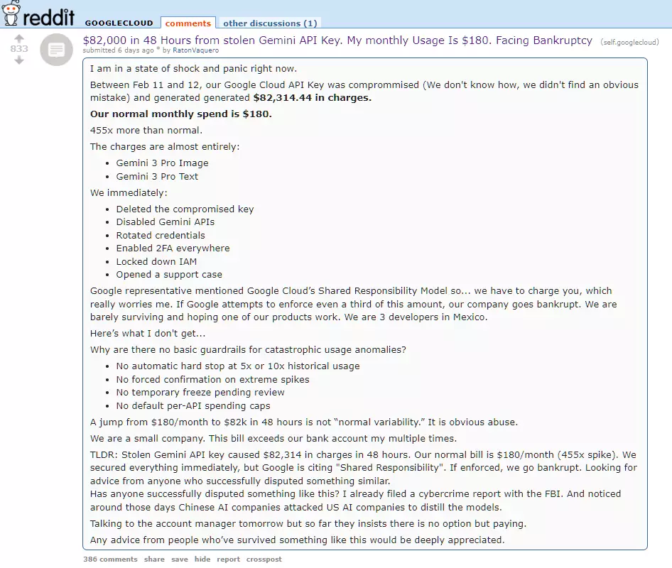 Oppure, ancora più semplice, limiti di spesa predefiniti per API. Perché passare da 180 dollari mensili a oltre 82mila in due giorni non sembra una variazione normale.