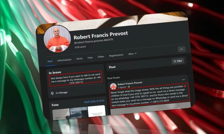 I criminali informatici creano un profilo fake, come in questo caso di Papa Leone XIV. Viene ovviamente utilizzata la foto reale dello stesso Pontefice per conferire credibilità al profilo. Poi si passa alla fidelizzazione dell’utente. Attraverso post a tema religioso, citazioni, immagini di croci o Bibbie, il truffatore crea un’aura di autorevolezza che induce le persone a fidarsi.