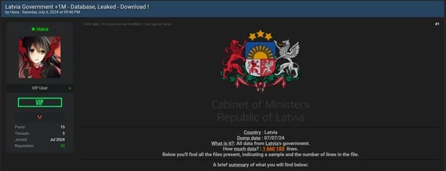 L’annuncio della violazione è stato fatto su un forum specializzato, dove l’utente identificato come Hana ha pubblicato il messaggio iniziale. Hana, un utente VIP con 15 post e una reputazione di 30, ha indicato che il dump dei dati include 1.660.183 linee. La pubblicazione contiene una descrizione dell’entità della fuga, sottolineando che tutti i dati del governo lettone sono stati compromessi.