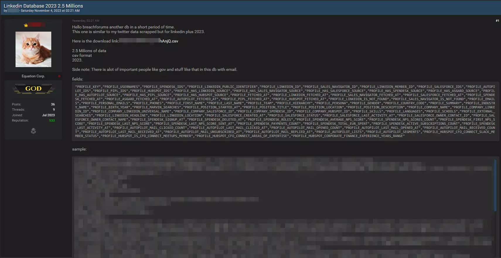 Il crimine informatico è in costante evoluzione, e le comunità online dove i criminali informatici condividono e negoziano dati rubati sono al centro di queste attività. Il messaggio pubblicato da un utente anonimo su Breach Forums ha gettato una luce sinistra sulla situazione. L’utente ha dichiarato: “Ciao breachforums un altro db in un breve periodo di tempo. Questo è simile ai miei dati twitter ma per linkedin plus 2023.”