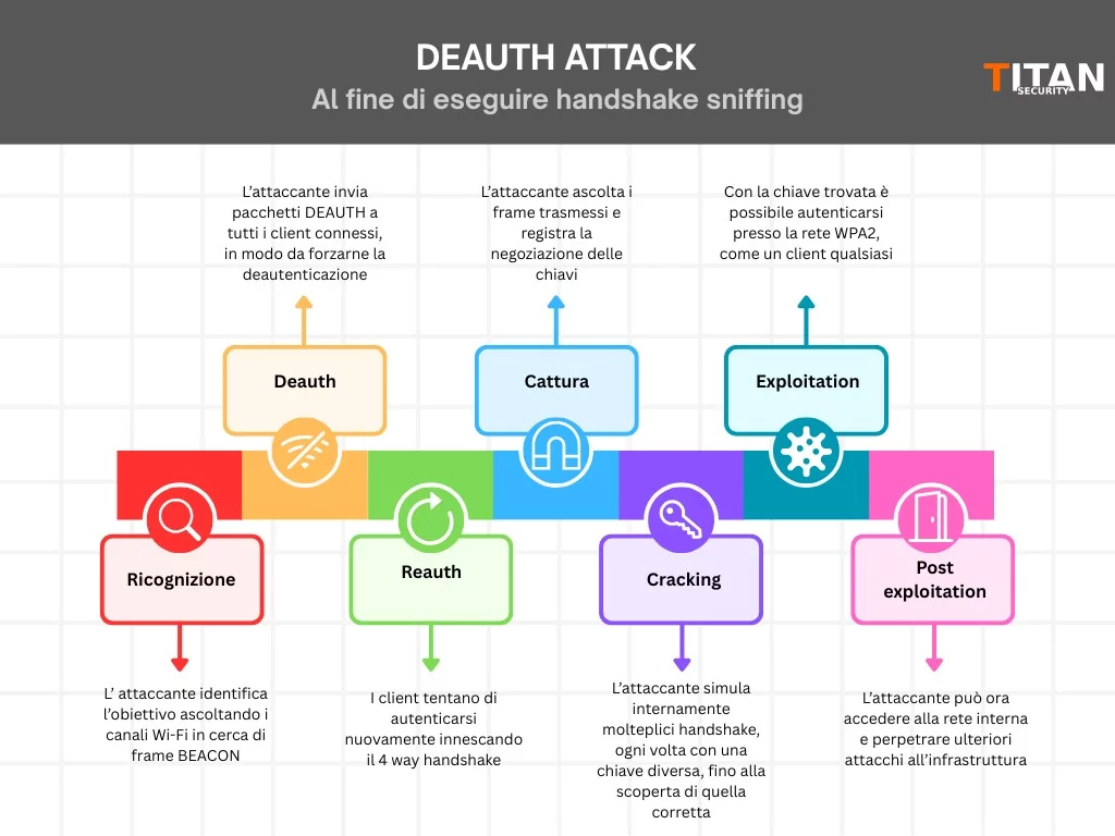 Il Deauth attack è uno degli attacchi più noti e storicamente utilizzati contro reti WPA2-Personal, soprattutto come fase preparatoria per altri attacchi.