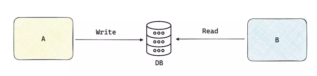 Questo è il metodo forse più facile ed intuitivo. Supponiamo che il processo A deve processare dei dati e creare un risultato x. Il processo B in seguito necessita di quel risultato x per partire. Quello che possiamo fare è creare un database comune dove A può andare a scrivere i suoi risultati, e dove B può leggere i risultati prodotti da A.