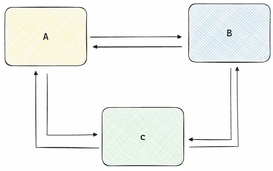 Utilizzare il real-time transport può essere utile quando l’architettura è più complicata. Immaginiamotre servizi, che sono per forza di cose dipendenti l’uno dall’altro. Cioè ogni servizio a bisogno di chiedere dati agli altri due per funzionare.