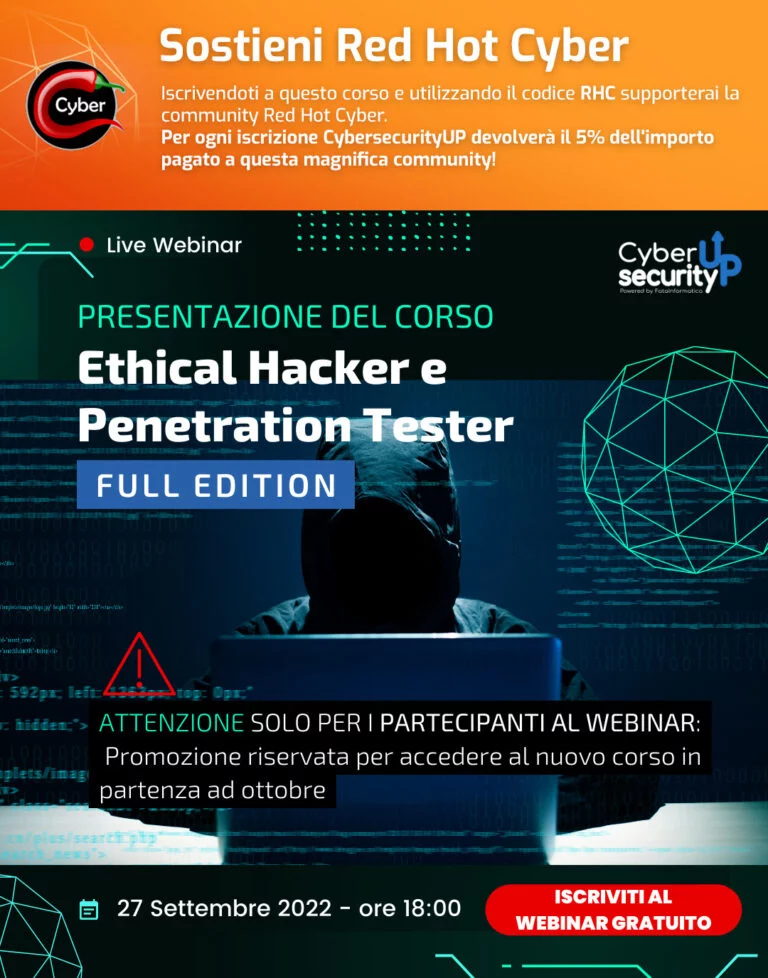 Per iscrivervi al webinar utilizzate questo link: Webinar Ethical Hacker e Penetration Tester (cybersecurityup.it)