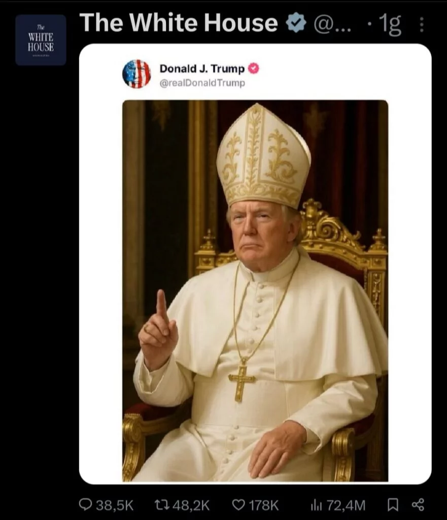 Donald Trump ha pubblicato un’immagine di sé stesso nei panni del pontefice, generata dall’intelligenza artificiale. E questo alla vigilia del conclave che eleggerà il nuovo capo della Chiesa cattolica, che conta 1,4 miliardi di fedeli in tutto il mondo.