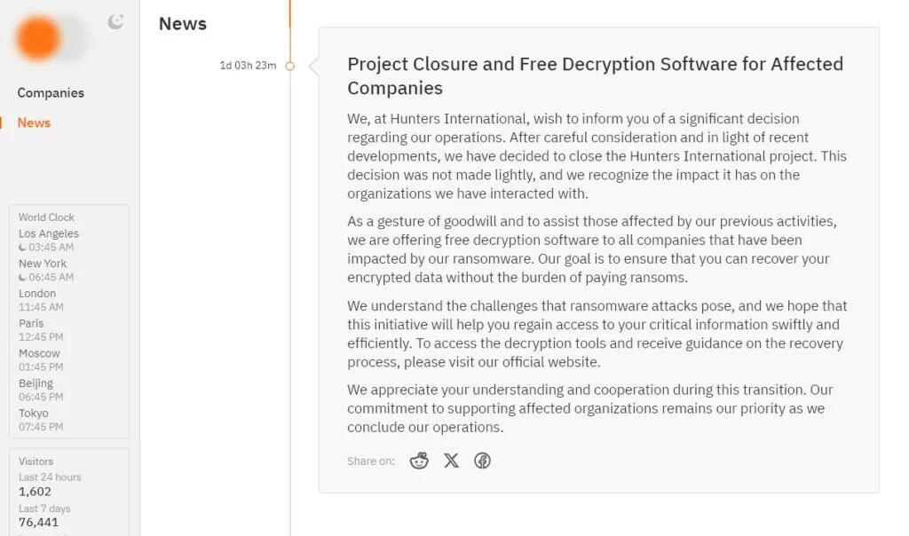 Come “gesto di buona volontà”, Hunters International promette di fornire a tutte le aziende colpite strumenti gratuiti per recuperare i dati crittografati. Anche la pagina compromettente del loro sito web, che in precedenza pubblicava i dati delle vittime che si erano rifiutate di pagare il riscatto, è stata completamente cancellata. Qualsiasi organizzazione attaccata dal gruppo può richiedere programmi di decifratura e istruzioni su come recuperare le informazioni.