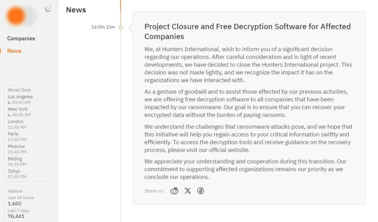 Hunters International, il gruppo responsabile di uno dei più grandi attacchi ransomware degli ultimi anni, ha annunciato ufficialmente la cessazione delle sue attività. In una dichiarazione pubblicata sul suo portale darknet, il gruppo ha dichiarato di voler cessare le attività e di offrire strumenti gratuiti per decriptare i dati delle aziende colpite.