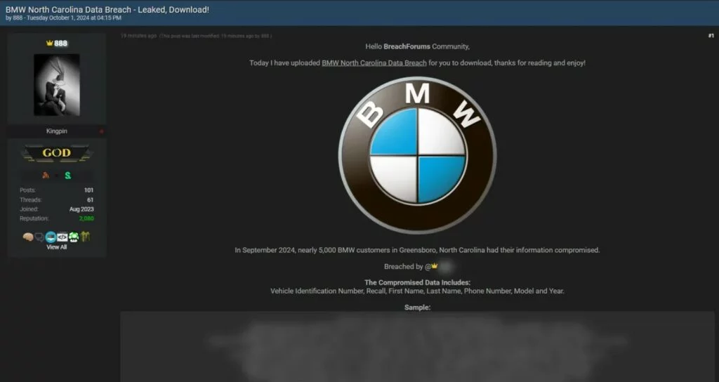 Secondo quanto riportato nel post, si tratta di 5.000 clienti BMW a Greensboro, nella Carolina del Nord. La pubblicazione è avvenuta il giorno 1 Ottobre 2024 sul noto sito BreachForums, con il Threat Actor 888 che ha reso disponibili i dati per il download al pubblico.