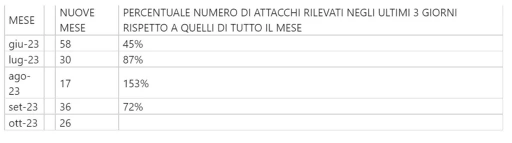 E’ un evidente sintomo del riacutizzarsi di una campagna di attacchi. In soli 4 giorni il numero di nuovi siti rilevati ha raggiunto il 45% se si considerano i numeri in tutto il mese di Giugno, mese in cui è stata per la prima volta riconosciuta la campagna, numeri destinati a salire ancora: 87% se si considera Giugno, 72% Settembre.