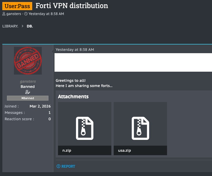 Il titolo è diretto: “Forti VPN distribution”. Il messaggio ancora di più: “Greetings to all! Here I am sharing some forts…”. Due allegati, n.zip e usa.zip, la cui nomenclatura suggerisce già una segmentazione geografica del materiale, scaricabili liberamente da chiunque sia registrato al forum.