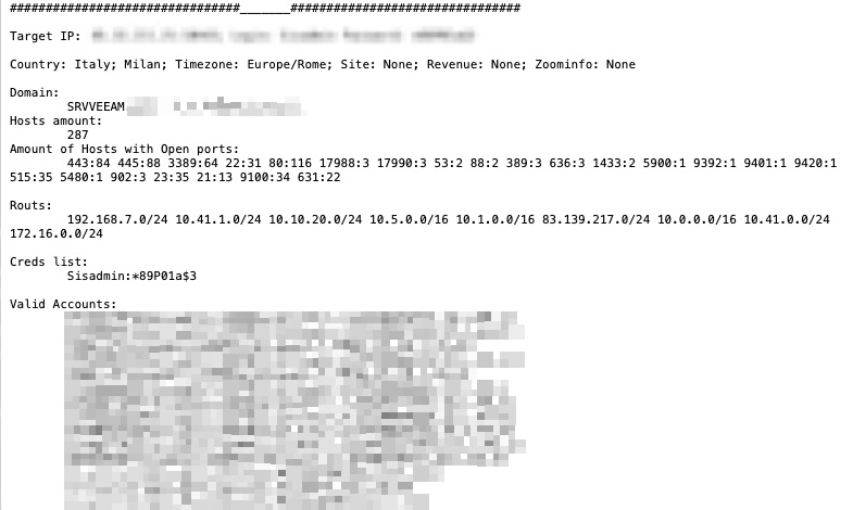 Per ciascun target il report documenta: indirizzo IP pubblico e porta di accesso VPN, credenziali di accesso in chiaro, paese e fuso orario, fatturato aziendale stimato (dove disponibile da fonti come ZoomInfo), nome di dominio e hostname interni, numero totale di host attivi con le relative porte aperte, subnet interne mappate, elenco completo degli account validi con sessioni autenticate confermate, incluse le sessioni Null Session, e infine un blocco dedicato alle vulnerabilità identificate e già verificate.