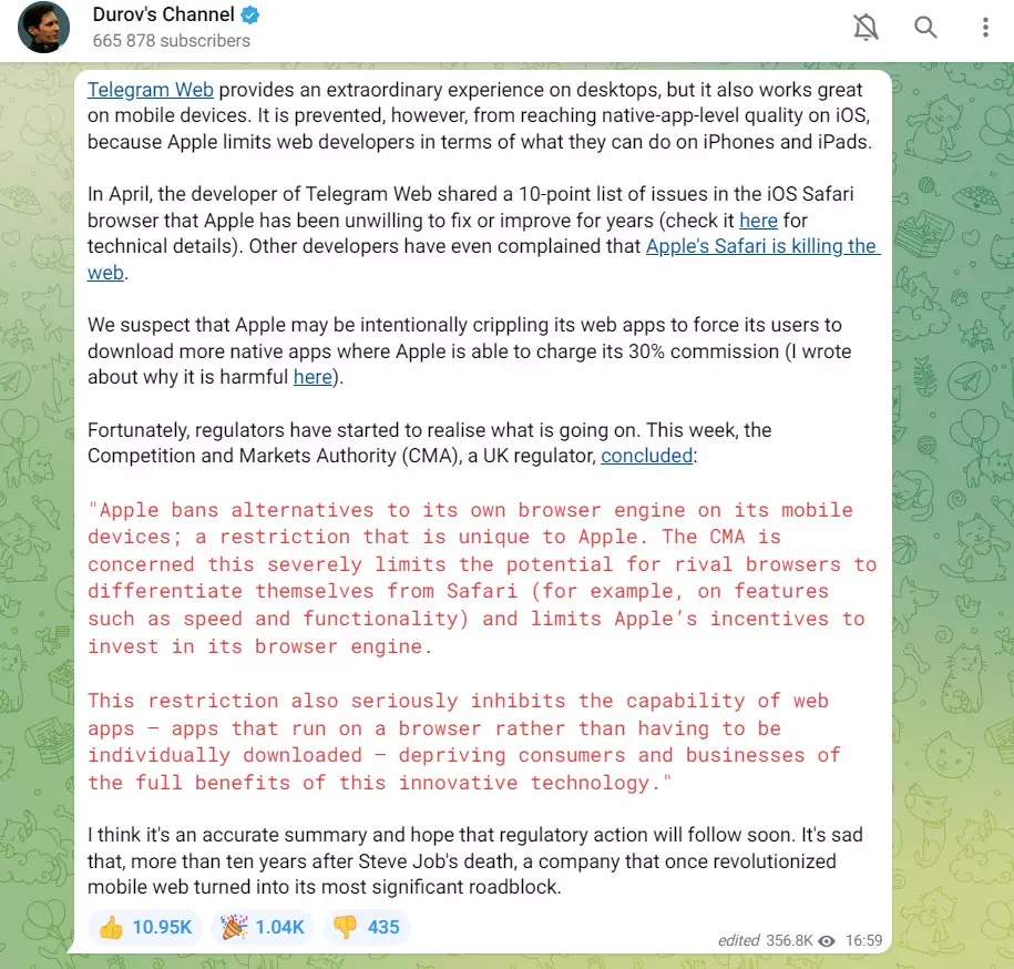 Pavel Durov ha accusato Apple di limitare deliberatamente gli sviluppatori web, il che, secondo lui, è il motivo per cui Telegram Web non riesce a raggiungere il suo pieno potenziale sui dispositivi iOS.