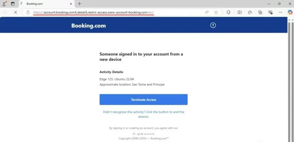 Tutto ciò che precede “www-account-booking[.]com” è solo un sottodominio che imita la struttura del sito reale. Il vero dominio registrato appartiene agli aggressori. Cliccandoci sopra, la vittima finisce sulla pagina