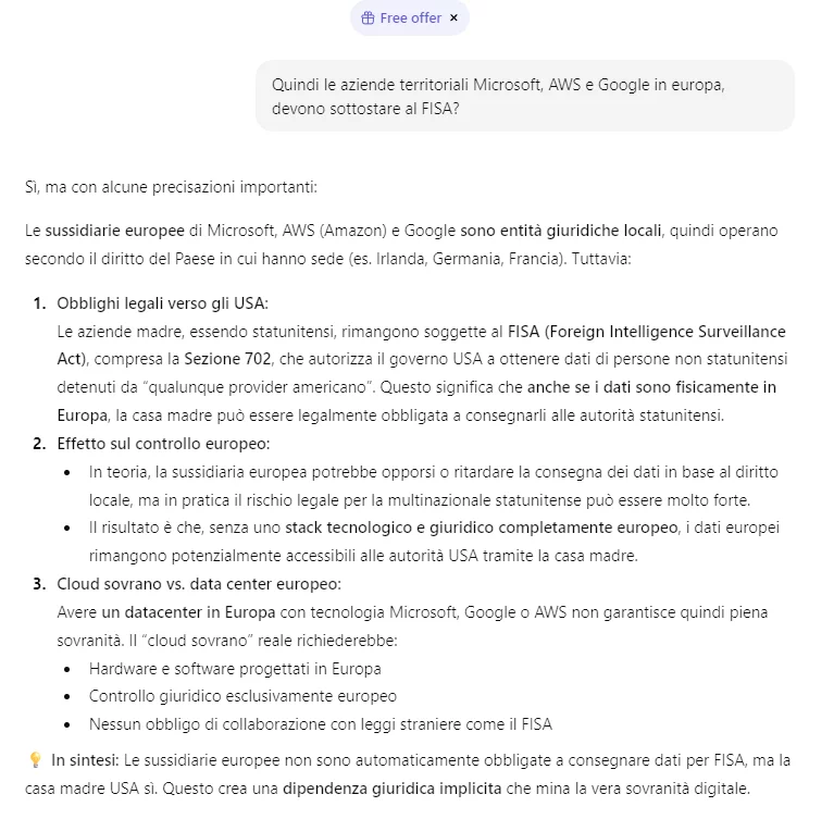 Il problema è strutturale e richiede una risposta diversa: uno stack tecnologico completamente europeo, progettato, gestito e governato in Europa. Dall’hardware al software, dai sistemi di orchestrazione ai servizi di sicurezza, il controllo deve essere esercitato da soggetti sottoposti esclusivamente al diritto europeo. Questo aspetto diventa ancora più rilevante se si considera che tutte le aziende statunitensi sono obbligate a rispondere a normative come il FISA (Foreign Intelligence Surveillance Act) e, in particolare, alla famigerata Sezione 702. Questa disposizione consente alle autorità statunitensi di raccogliere informazioni di intelligence su persone non statunitensi situate all’estero, obbligando le aziende americane a collaborare e a fornire accesso ai dati, spesso senza possibilità di notifica agli interessati o ai governi stranieri coinvolti.