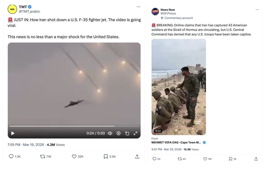 Le due reti stanno condividendo un elemento interessante, l’uso sistematico di contenuti generati dall’intelligenza artificiale come i video di soldati catturati, aerei abbattuti o attacchi mai avvenuti, i quali hanno raccolto milioni di visualizzazioni. Le politiche sulla piattaforma prevedono forti restrizioni su materiale non etichettato relativo a conflitti armati.