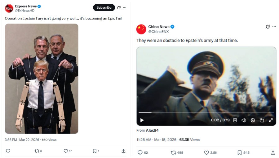 Queste narrazioni, stanno seguendo uno schema ricorrente, dove da una parte vengono esagerati i successi militari iraniani, dall’altra, invece, vengono portati all’attenzone gli attaccati degli Stati Uniti e di Israele con contenuti falsi. Sono circa 200 i post che collegano la guerra in Iran e il caso Epstein, e questi post hanno raggiunto oltre 17 milioni di visualizzazioni complessive con questa sola narrativa.