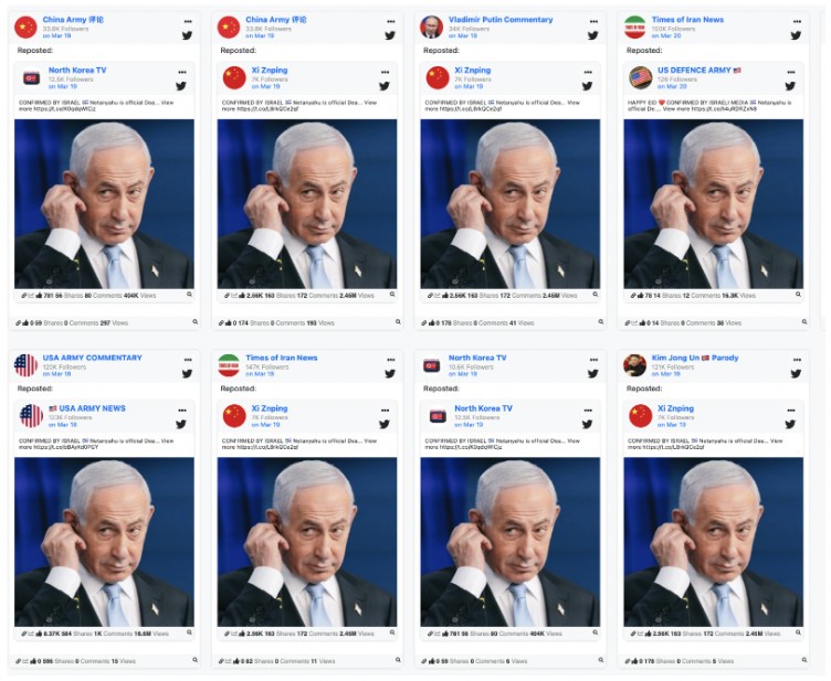 Diversi account Verified4War pubblicano e ripubblicano la stessa immagine di Netanyahu, tutti con didascalie simili sulla sua morte, e pubblicati approssimativamente nello stesso momento. (fonte isdglobal)