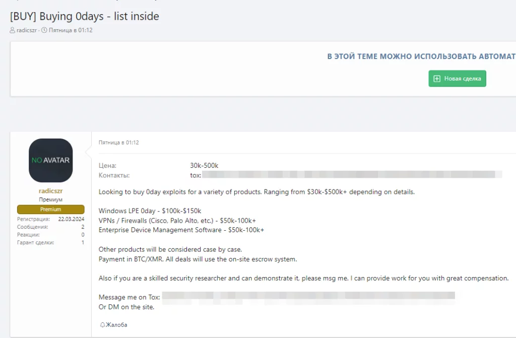 Un post pubblicato nelle underground in lingua russa, riporta una richiesta di acquisto di exploit0day, vulnerabilità sconosciute e non risolte in software, hardware, e infrastrutture di rete.