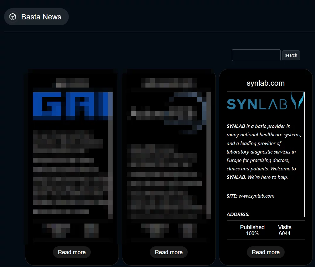 Nel pomeriggio del 13 maggio 2024, come da nostro comunicato pubblicato lo stesso giorno, l'organizzazione cybercriminale "Black Basta", responsabile dell'attacco informatico, ha pubblicato in aree del dark web, informazioni sottratte illecitamente a SYNLAB, compresi documenti e dati personali.