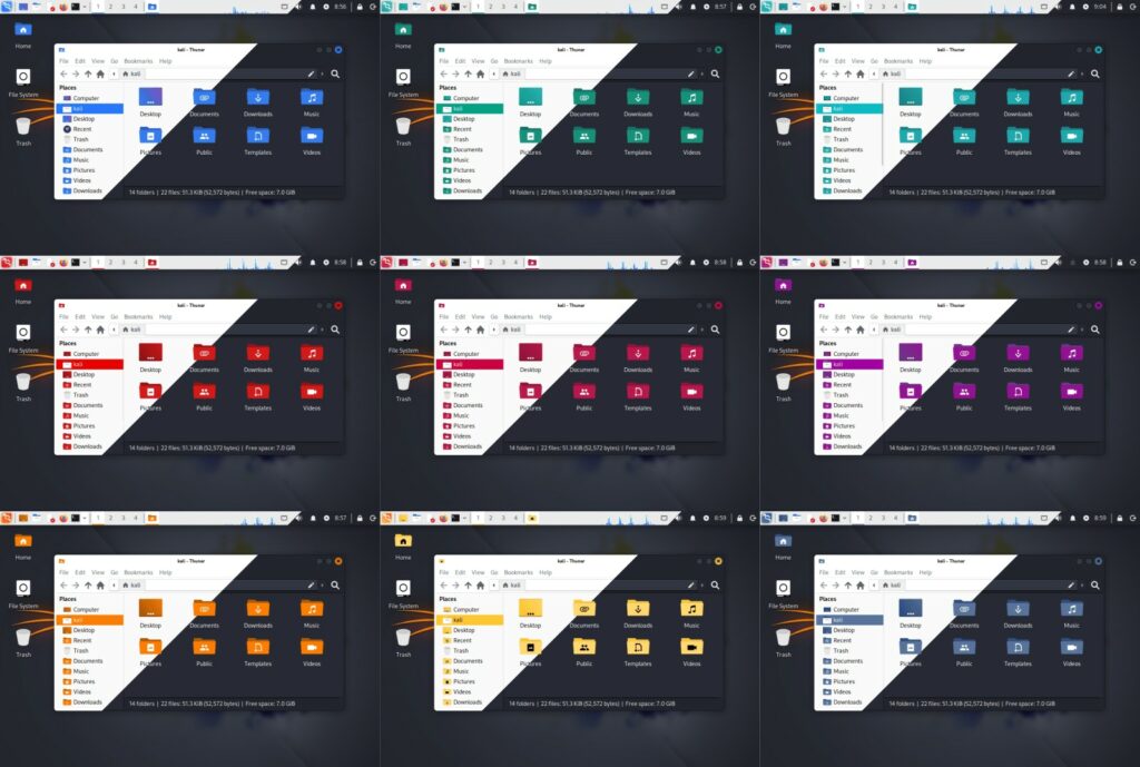 In Xfce, che rimane il desktop predefinito di Kali, è stato aggiunto un nuovo sistema di gestione dei colori, che finalmente raggiunge la parità con la personalizzazione visiva di GNOME e KDE. Gli utenti possono ora modificare i temi delle icone, i colori GTK/Qt e le decorazioni delle finestre tramite lo strumento Aspetto di Xfce e le utilità qt5ct / qt6ct.