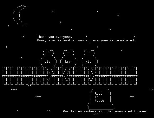 Il gruppo ha condiviso un’immagine ASCII emotiva che rappresenta tre gatti con i nomi “vio,” “kry,” e “kit,” seduti su una recinzione sotto un cielo stellato, con un’epigrafe che recita: “Grazie a tutti. Ogni stella è un altro membro, tutti sono ricordati. Riposa in pace. I nostri membri caduti saranno ricordati per sempre.”