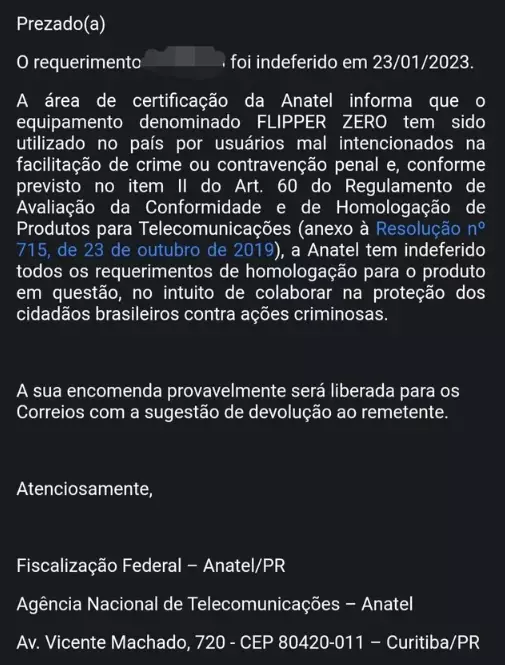 Bleeping Computer riferisce che molti brasiliani che hanno acquistato il Flipper Zero riferiscono che i loro pacchi sono stati reindirizzati all’Agenzia brasiliana per le comunicazioni perché i dispositivi non erano certificati dal dipartimento delle radiofrequenze del paese.