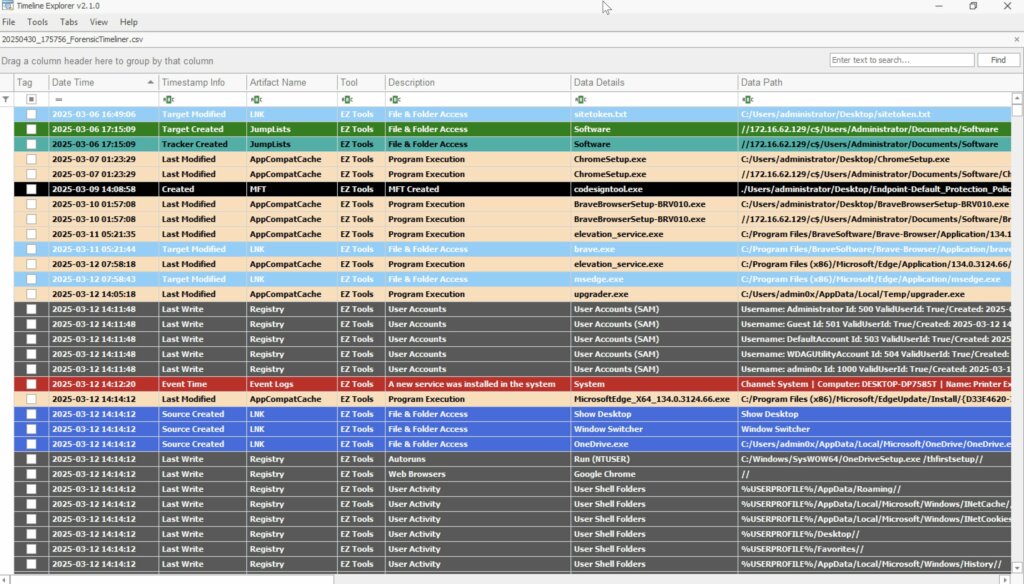 Forensic Timeliner è un motore di elaborazione forense ad alte prestazioni pensato per supportare gli analisti DFIR (Digital Forensics and Incident Response) nelle attività di triage e correlazione degli artefatti. Lo strumento consente di aggregare rapidamente file CSV provenienti dai principali tool forensi, trasformandoli in una sequenza temporale unica, filtrabile e pronta per l’analisi investigativa.