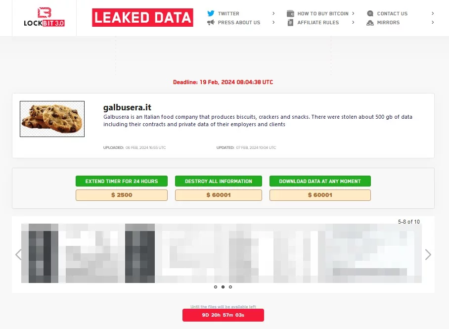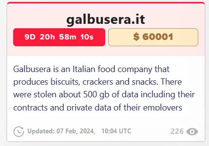 LockBit 3.0 avvia il consueto “countdown” fissato tra 10gg, data della pubblicazione dei dati esfiltrati nelle underground, che avverrà il 19 febbraio alle ore 08:04 ora UTC. Sul loro sito nelle underground è riportato quanto segue : “Galbusera is an Italian food company that produces biscuits, crackers and snacks. There were stolen about 500 gb of data including their contracts and private data of their employers and clients” e il sito riportato è galbusera.it.