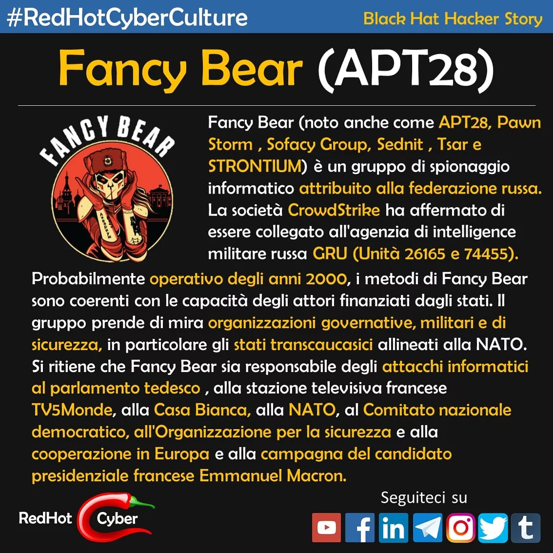 Fancy Bear, è un team di #hacker che lavora per il #GRU della #Russia, che è stato responsabile di operazioni di hack-and-leak mirate alle elezioni presidenziali statunitensi del 2016 a un’ampia campagna di tentate intrusioni contro partiti politici, società di consulenza questo anno.