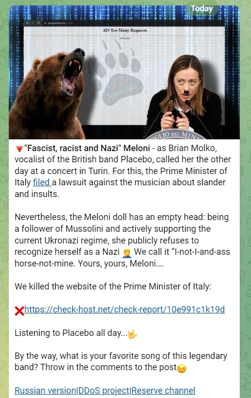 Dopo le aziende di mobilità di lunedì, le banche di martedì e i Media di Mercoledì e le telco di giovedì, si cambia nuovamente obiettivo. Questa volta il gruppo di hacktivisti colpisce il sito del Primo Ministro italiano Giorgia Meloni, che sta resistendo all’attacco ma solo dall’Italia.