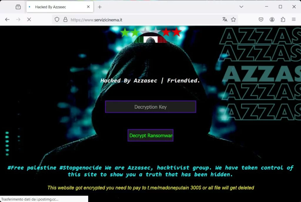 Azzasec, un collettivo noto per le sue azioni di hacking politicamente motivate, ha reso noto di aver ottenuto accesso al sito di Servizi Cinema e ha eseguito azioni di “deface” alla pagina principale. Da quanto riportato nel deface, sembrerebbe che all’interno del sito sia stato rilasciato un ransomware che chiede un riscatto di 300 dollari. Ransomware che recentemente è stato pubblicizzato da AzzaSec nelle underground.