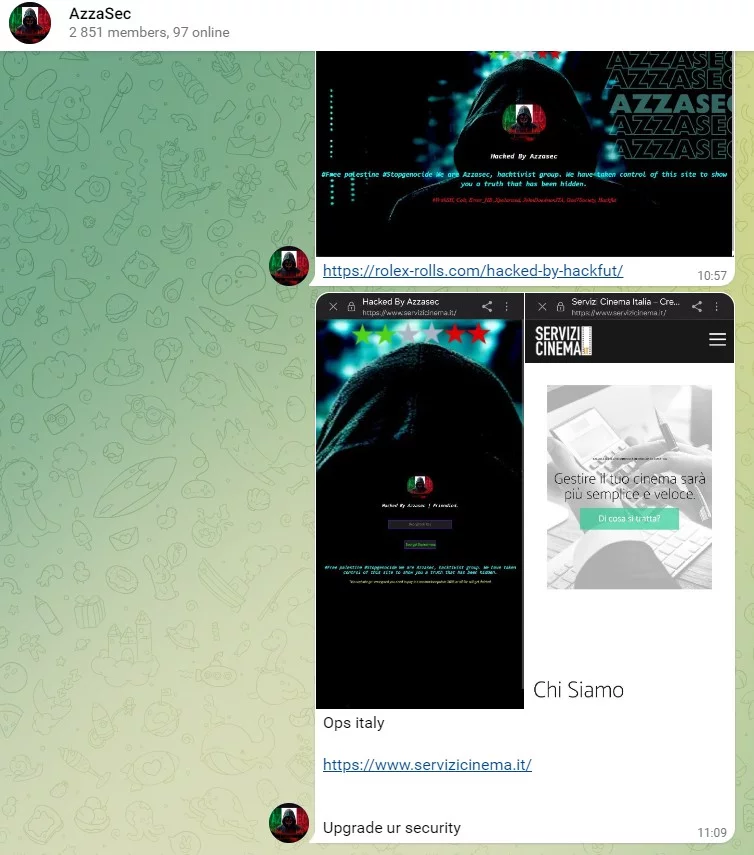 Recentemente, il gruppo hacktivista italiano noto come Azzasec ha portato avanti una violazione del sito web https://www.servizicinema.it/. Questo episodio è stato descritto da Azzasec come un atto di protesta in solidarietà con la Palestina e la Russia.