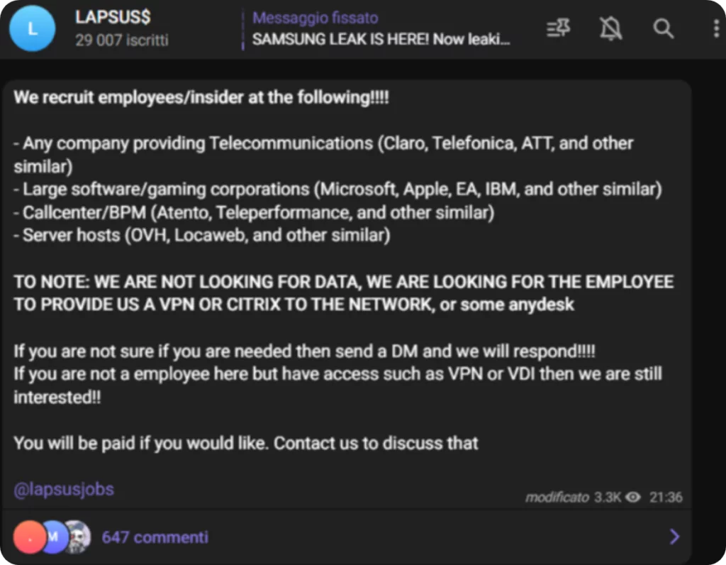 Numerose cybergang, tra cui LockBit e Lapsus, hanno fatto appello agli impiegati infedeli per acquisire informazioni utili per violare i sistemi informatici delle aziende. Questi attaccanti possono tentare di contattare gli impiegati infedeli stessi attraverso canali di comunicazione online o attraverso il loro network di contatti.