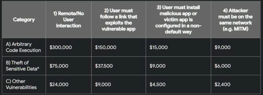 L’azienda ha apportato modifiche al suo programma bug bounty Mobile Vulnerability Rewards Program (Mobile VRP), lanciato lo scorso anno. I nuovi termini si applicano principalmente alle app che l’azienda classifica come Tier 1: servizi Google Play, app Ricerca Google per Android (AGSA), Google Cloud e Gmail.